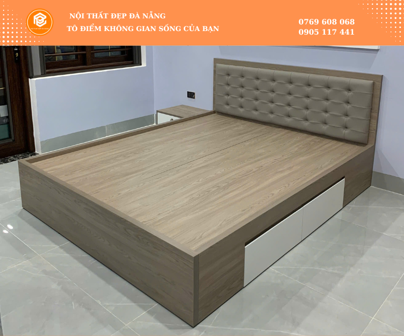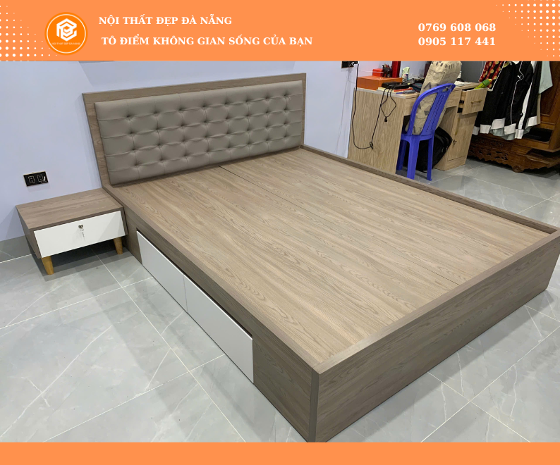 Tận dụng các đồ nội thất có sẵn trong nhà, căn phòng này sẽ được thi công thêm giường ngủ. Với màu sắc xám vân gỗ phù hợp với sở thích của cậu con trai. Màu sắc trung tính làm cho căn phòng thêm rộng rãi và thoáng mát hơn. Bên trên đầu giường cũng được thiết kế bằng một lớp nệm da simili. Hai thọa kéo bên hông giường và một chiếc tab đầu giường nhỏ gọn, sang trọng. Tổng thể vô cùng hài hòa với kích thước giường 1m6 x 2m. Kích thước rộng rãi đủ để người sử dụng có thể thoải mái với không gian riêng của mình.