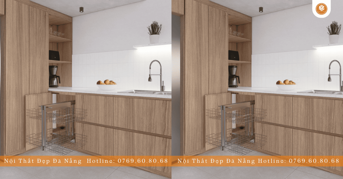 Một điểm nổi bật là việc kết hợp phụ kiện hiện đại như giá xoay góc, ray trượt giảm chấn, kệ úp chén inox. Những chi tiết này giúp tối ưu công năng, biến căn bếp nhỏ thành nơi lưu trữ gọn gàng.